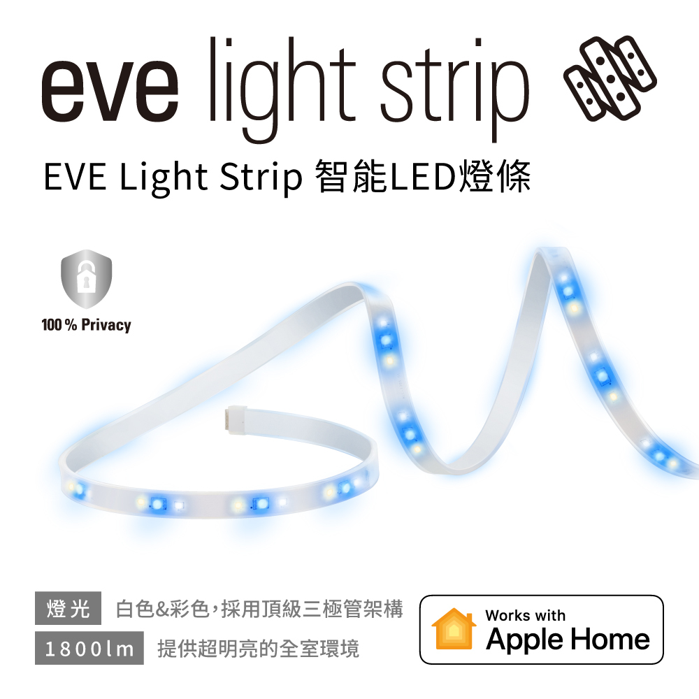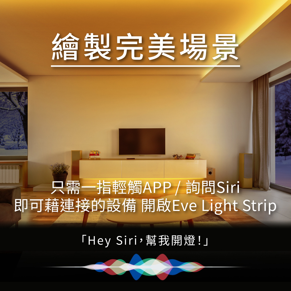 燈光除了帶來照明外,也有溫暖人心的功效,也可以讓人有個安心感,eve Light Strip 智能LED燈條,可以依照您每天心情調整燈光以及亮度,讓eve陪您一起亮著燈光,守護家人的幸福,還能搭配IPhone/IPad/HomePod mini輕鬆地設置的區域燈光狀況,Eve 與您一起打造智慧家庭。
